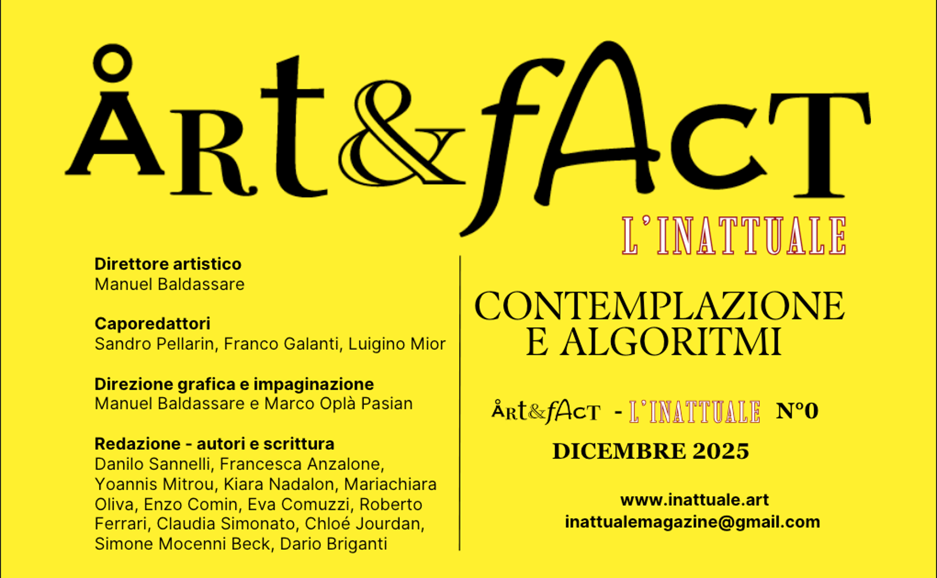 Questa non è una rivista periodica: esce solo quando deve. Non rincorre il presente, lo devia. Ogni numero nasce come necessità, unico e irripetibile. Ogni uscita porta con sé la forza di un gesto inatteso, capace di incrinare abitudini, standard e certezze che oggi si moltiplicano e soffocano la vitalità del pensiero.
